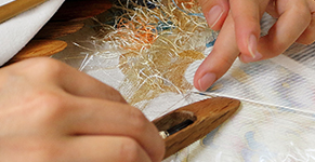 人の爪先をやすりで削り爪をくしのかわりにして織る。ハツリとぼかしを合わせて使いこなして、職人の感性で織りあげる。