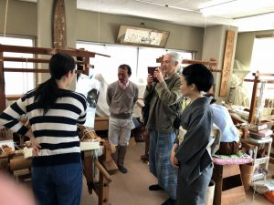 日本の着物文化を世界に発信する活動されておられます Junko Sophie Okimotoさまとエバレット・ブラウンさまが、EPA通信社の取材で弊社の西陣爪掻本つづれ織工房へお越し頂きました。
