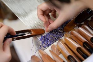 つづれ織の起源はエジプトのコプト織、フランスのゴブラン織、シルク交易により中国にわたり刻絲織といわれました。日本に伝わったのは聖徳太子(遣隋使)の頃と言われております。柄の細密な表現のために、爪先をヤスリで削り、ノコギリ状にした指で糸を掻き寄せて織り上げる技法『爪掻きつづれ織』が出来ました。とても特徴のある織り方で日本特有の織り方です。世界に発信して頂けるとお聞きして、今まででは考えられない光栄なことと、またこれを繋げていく事の責任の重さを感じております。